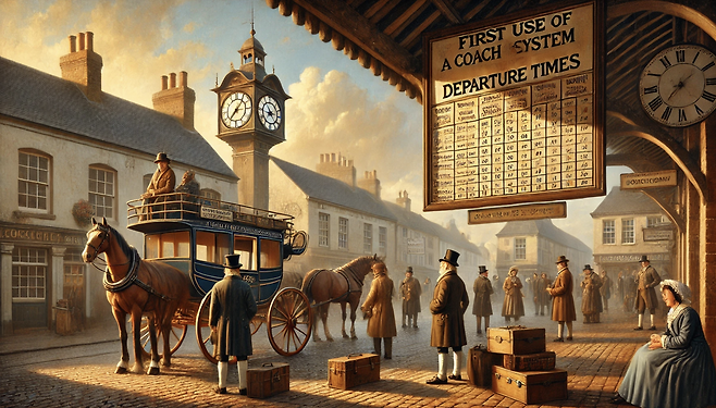 처음으로 시간표 체계가 도입된 곳은 대중교통이었어요. 1784년, 영국에서는 마차 서비스에 운행 시간표를 처음으로 적용했는데요, 당시 영국은 도시마다 시간이 달랐어요. 도시별로 시간이 다르다 보니 역에는 마차의 출발 시간만 표시되었을 뿐, 도착 시간은 알 수 없었습니다.