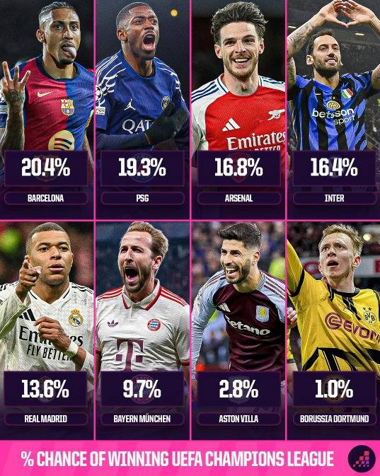 2위는 16강전에서 리버풀을 꺾고 올라온 PSG다. 옵타는 파리의 우승 확률을 19.3%로 분석했다. 3위는 16.8%의 아스날이며, 이보다 근소한 차이로 인테르가 16.4%로 4위를 차지했다.
