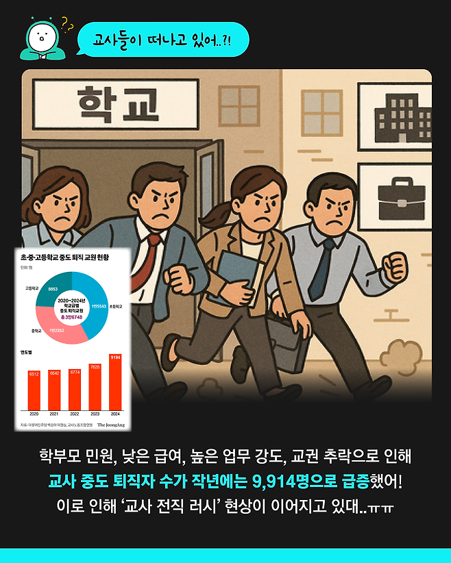 학부모 민원, 낮은 급여, 높은 업무 강도, 교권 추락으로 인해 교사 중도 퇴직자 수가 급증하면서 '교사 전직 러시' 현상이 이어지고 있습니다.