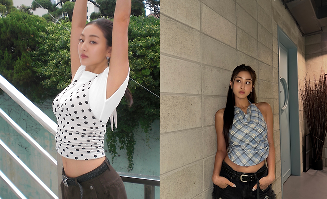 지효는 화이트 베이스에 블랙 도트가 프린트된 홀터넥 탑으로 상큼한 매력을 연출하고 있다. 브라운 톤의 로우라이즈 카고팬츠와 매치하여 Y2K 감성을 살린 스타일링을 선보였다. 특히 홀터넥 디자인이 어깨 라인을 강조하며 시원한 여름 룩을 완성했다.
