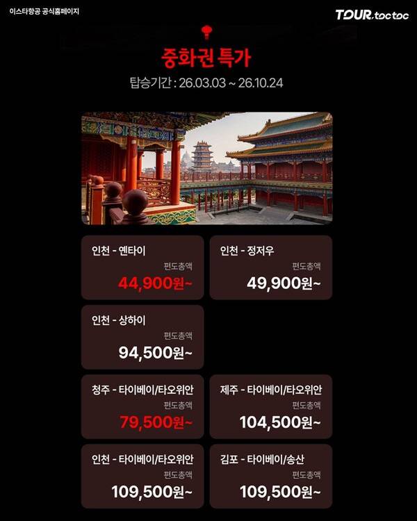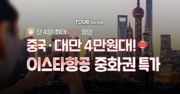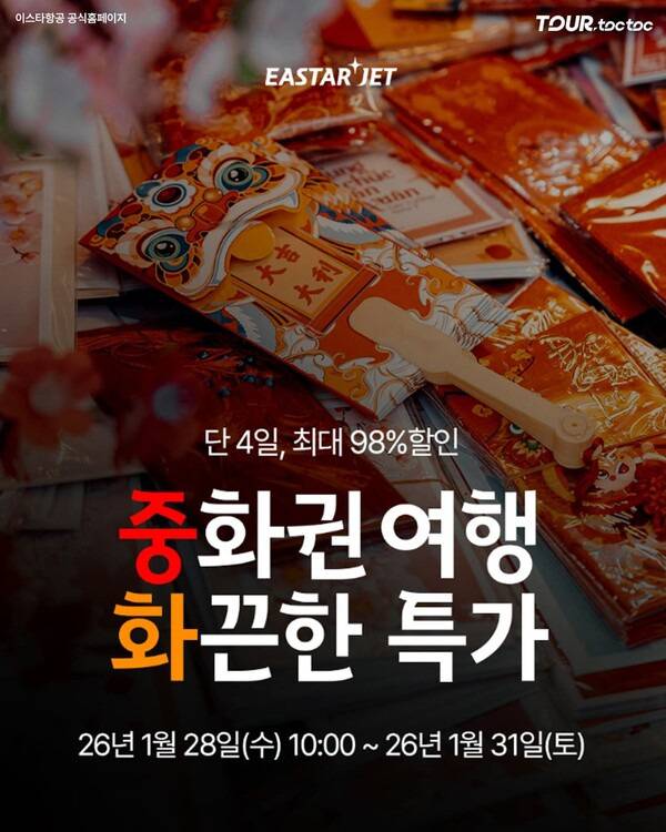 이스타항공이 2026년 중화권 노선 대상 항공권 특가 프로모션을 1월 28일 오전 10시부터 31일까지 4일간 실시합니다.