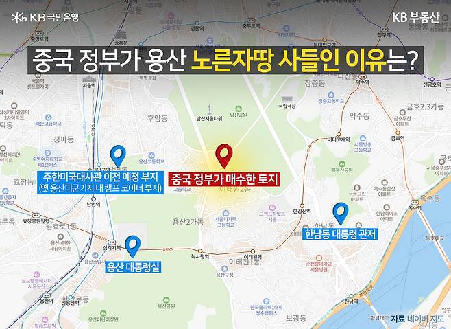 해당 토지는 용산 대통령실, 한남동 대통령 관저, 그리고 주한미국대사관이 이전할 예정인 옛 용산미군기지 내 캠프 코이너 부지와도 불과 1~1.5km 거리로 가까운 위치에 있습니다. 중국 정부가 매입한 총 11개 필지 중 2개는 원래 우리 정부가 소유하고 있던 땅이었으며, 정부는 2017년 6월 이 중 대지와 임야 각 1필지를 일반인에게 매각했습니다. 이후 이 부지를 중국 정부가 매입하면서, 정부에서 개인, 다시 중국 정부로의 소유권 이전이 불과 1년 6개월 만에 이루어진 것입니다.