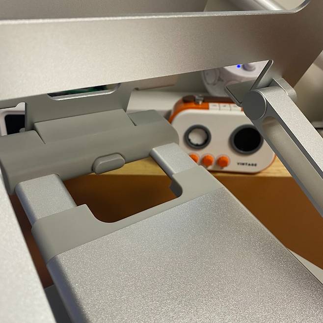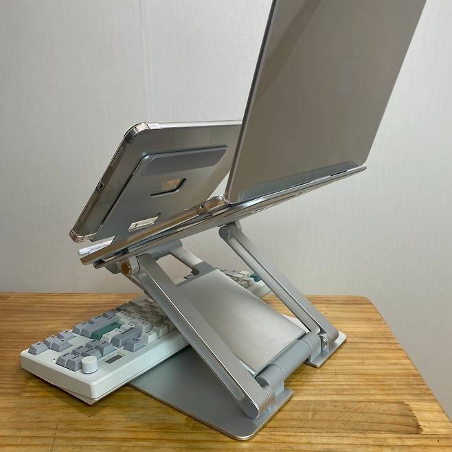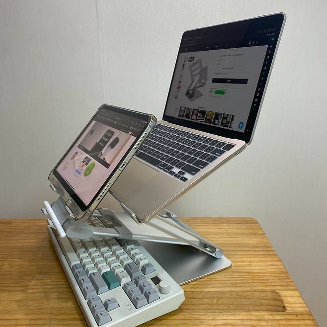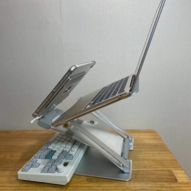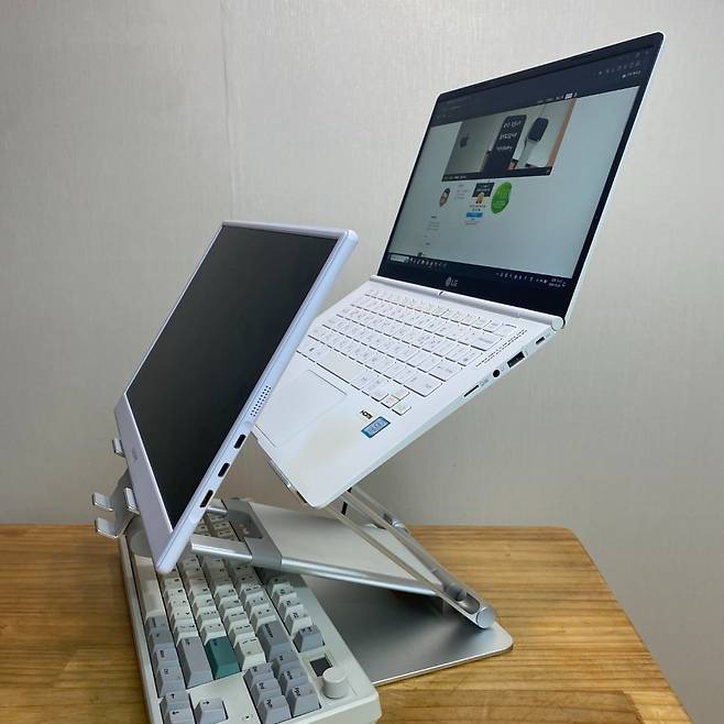 그렇다고 이 제품이 맥북 사용자만의 전용 제품은 아닙니다. 윈도우 노트북도 당연히 사용 가능하죠. 저는 윈도우 노트북을 상단에 두고 태블릿 거치대에는 휴대용 모니터를 두었습니다. 노트북에서는 작업을 하면서 휴대용 모니터로는 유튜브나 넷플릭스 같은 영상을 감상할 수도 있죠. 어떻게 활용하느냐에 따라 무궁무진하게 쓸 수 있습니다. 단순히 두 개의 기기를 올린다는 개념을 넘어 여러 개의 디스플레이를 하나처럼 사용하므로 작업의 생산성을 높이면서 공간도 아낄 수 있죠. 이 부분이 이 제품이 가지는 강점 같습니다.