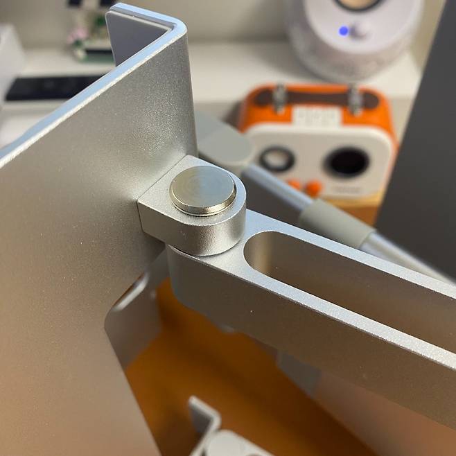이 제품은 4개의 관절과 하나의 길이 조절 버튼이 있습니다. 두 개의 기기를 동시에 거치하기 때문에 노트북 거치용 관절이 두 개, 태블릿용 관절 2개가 있죠. 자세를 잡으려고 관절을 움직여 보는데 움직이지 않는 것입니다. 고장인가? 전용 드라이버로 나사를 풀어야 하나? 이리저리 봐도 별도의 드라이버를 이용하는 것은 아닌 것 같아 힘을 주니 그제서야 관절이 움직입니다. 노트북 거치대 관절은 일반적으로 나사로 고정하는 방식과 그렇지 않은 방식으로 나뉘는데 이 제품은 나사가 없는 방식입니다. 그러다 보니 힘을 많이 주어야 하는데요, 성인 남자들은 조금 힘을 들이면 되는 정도이지만 여성은 무척 구부리기 힘들다고 합니다. 다만 한 번 고정하면 웬만해서는 흔들리거나 움직이지 않는 장점이 있지만 힘이 약한 분들은 참고해야 하겠네요.
