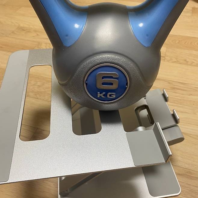 이처럼 단단한 관절을 가져서 인지 노트북 거치대는 최대 6킬로그램, 태블릿 거치대는 최대 4킬로그램까지 견딜 수 있다고 합니다. 아무리 무거운 노트북이라고 이 정도는 거의 없으니 안심하고 거치할 수 있겠네요. 사용하는 노트북 중에서 가장 무거운 것이 16인치 게이밍 노트북인데 이 정도 올려두어도 끄떡없습니다. 시험 삼아 6킬로그램짜리 케틀벨을 올려 봤는데 아래 거치 쪽에 두면 안정되게 받쳐주지만 상단 끝에 두면 힘에 부쳐 아래로 내려갑니다. 노트북의 경우 힘 점이 한 곳에 몰리는 케틀벨과 다르니 문제는 없어 보입니다. 태블릿 거치대에도 4킬로그램 덤벨을 올렸지만 의외로 잘 버티네요.