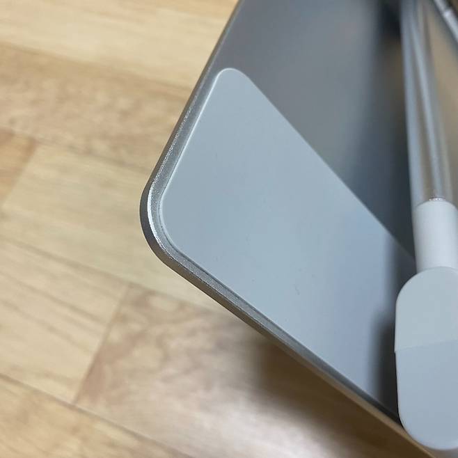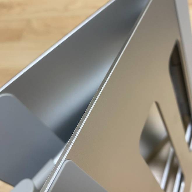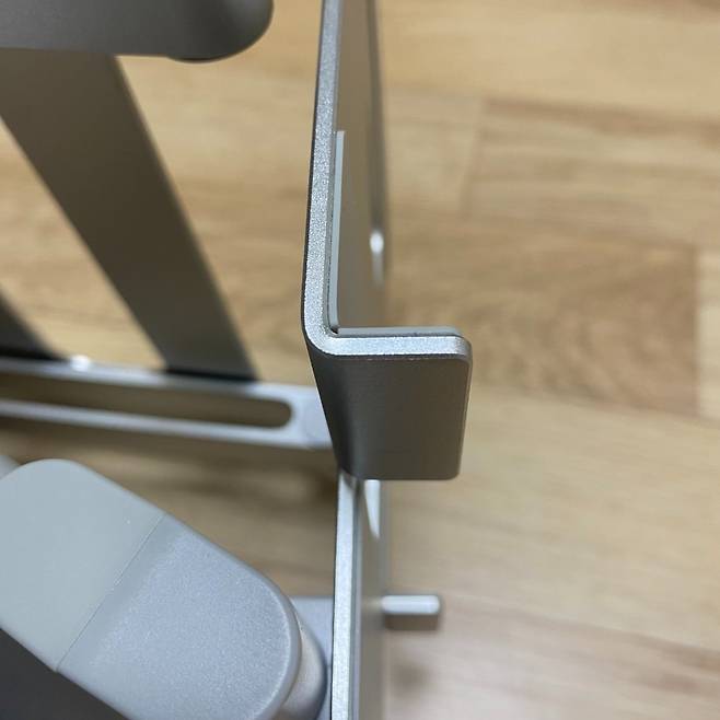 제품 하단에는 널찍한 실리콘 패드가 사방으로 부착되어 있습니다. 이 때문에 책상 위에 올려두면 미끄러지지 않고 흔들림도 거의 없습니다. 대부분이 금속 재질이라 측면 마감이 걱정되는 분들도 있을 것입니다. DW STAND 노트북 거치대는 모서리와 측면을 모두 라운드처리하여 손을 다칠 염려가 없습니다. 다만 관절 부분에 손가락을 깊숙이 넣고 움직이게 되면 끼일 수 있으니 조심해야 겠습니다. 특히 이 제품은 노트북 거치대 관절과 태블릿 거치대 관절이 한 부분에서 시작되기 때문에 이 부분에 손을 끼울 수 있습니다.