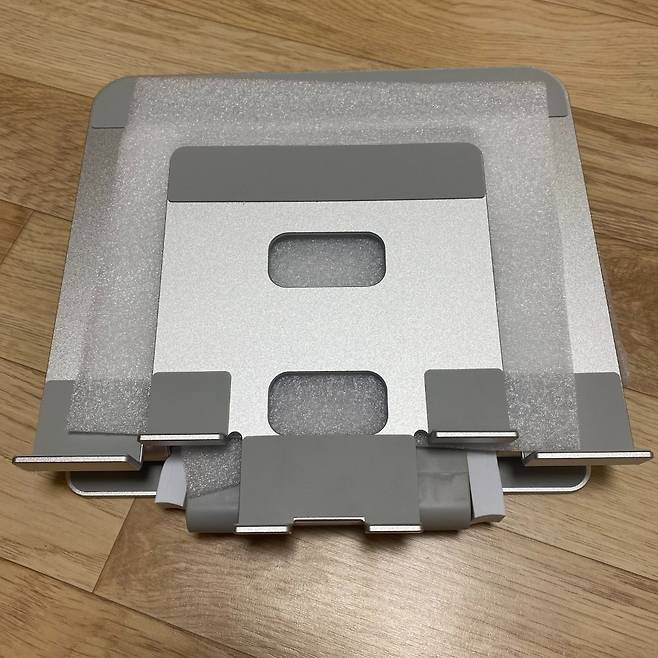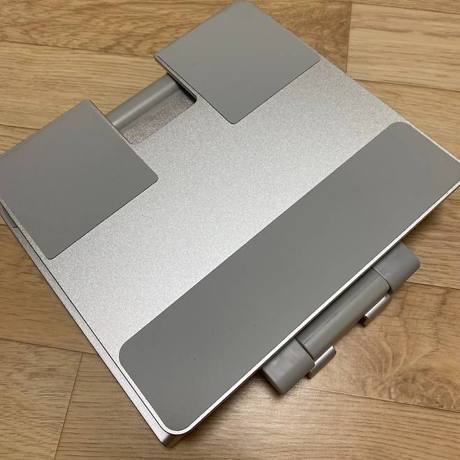 제품 바닥은 회전식이 아니고 고정식입니다. 일부 노트북 거치대가 회전식 제품이 있는데 저는 사용하면서 굉장히 편리했습니다. 이 제품은 고정식이라서 노트북 각도를 조금 좌우로 움직이고 싶으면 거치대 자체를 움직여 줘야 하는데 무겁고 바닥 실리콘 패드 성능이 좋아서 힘을 좀 주어야 합니다. 나중에 개선 모델이 출시된다면 회전 기능을 넣어 주면 어떨까 합니다. 대신 장점으로는 바닥과 관절 시작하는 부분에 공간이 생기므로 이 사이에 키보드를 수납할 수 있어 공간 활용에 좋습니다. 마치 계산 밑에 작은 창고를 만드는 것 처럼요.