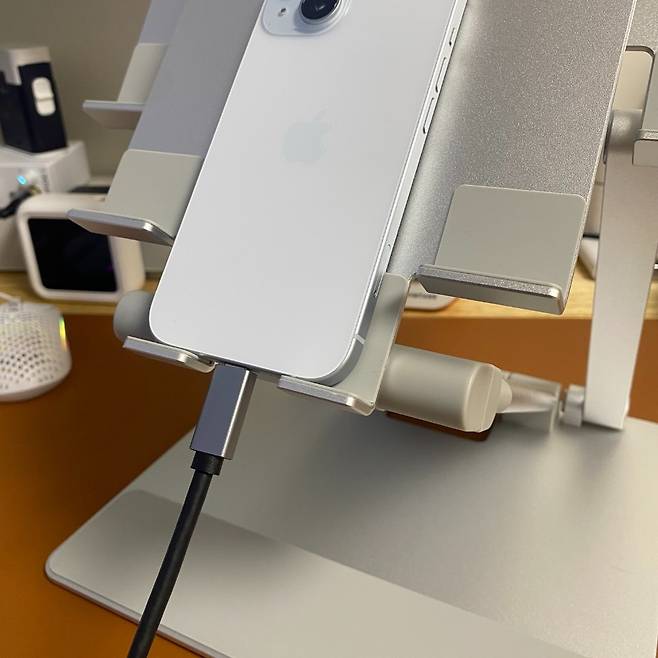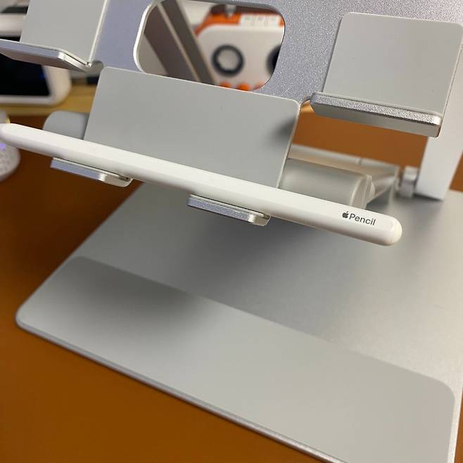 그리고 태블릿 거치대 아래에는 애플펜슬을 수납하는 거치대가 또 있습니다. 그러니 맥북, 아이패드, 애플펜슬까지 세가지 기기를 한 번에 수납하는 것이죠. 이 정도면 만드신 분이 애플 마니아인 것이 분명합니다. 애플에서는 이 제품을 공식 악세서리로 판매해도 손색이 없을 것 같아요. 애플펜슬을 수납하는 곳은 아이폰을 둘 수도 있습니다. 아이패드와 동시에 아이폰을 둘 수는 없지만 거치대 사이의 빈 공간으로 충전 케이블을 넣으면 아이폰을 충전하면서 거치가 가능합니다.