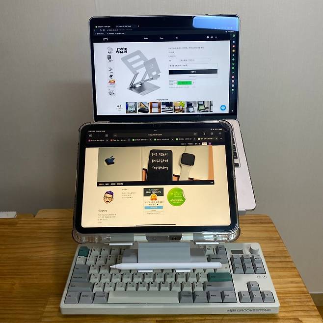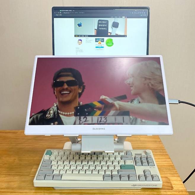 그렇다고 이 제품이 맥북 사용자만의 전용 제품은 아닙니다. 윈도우 노트북도 당연히 사용 가능하죠. 저는 윈도우 노트북을 상단에 두고 태블릿 거치대에는 휴대용 모니터를 두었습니다. 노트북에서는 작업을 하면서 휴대용 모니터로는 유튜브나 넷플릭스 같은 영상을 감상할 수도 있죠. 어떻게 활용하느냐에 따라 무궁무진하게 쓸 수 있습니다. 단순히 두 개의 기기를 올린다는 개념을 넘어 여러 개의 디스플레이를 하나처럼 사용하므로 작업의 생산성을 높이면서 공간도 아낄 수 있죠. 이 부분이 이 제품이 가지는 강점 같습니다.