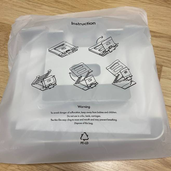 언박싱을 하면 제품을 감싸는 비닐에 설명서를 대신했습니다. 그림으로만 설명되었지만 직관적이어서 쉽게 이해가 됩니다. 비닐 하단에는 주의점이 있는데 유아나 아이 관련하여 다칠 수 있으니 주의하라는 문구가 있습니다. 아기 침대에 사용할 사람이 없겠지만 금속 관절을 사용하므로 아이들이 실수로 만지다가 질식을 하거나 팔다리가 끼일 수 있으므로 이런 부분은 주의해야 할 것 같습니다. 제품이 금속 재질인 만큼 스크래치나 손상 방지를 위해 스펀지, 종이 박스를 이용하여 제품을 꼼꼼하게 쌓았네요.