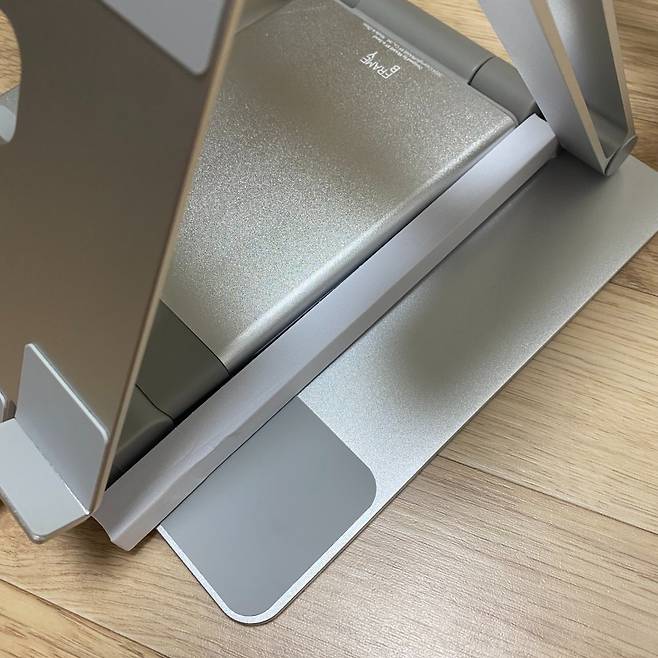 제품 바닥은 회전식이 아니고 고정식입니다. 일부 노트북 거치대가 회전식 제품이 있는데 저는 사용하면서 굉장히 편리했습니다. 이 제품은 고정식이라서 노트북 각도를 조금 좌우로 움직이고 싶으면 거치대 자체를 움직여 줘야 하는데 무겁고 바닥 실리콘 패드 성능이 좋아서 힘을 좀 주어야 합니다. 나중에 개선 모델이 출시된다면 회전 기능을 넣어 주면 어떨까 합니다. 대신 장점으로는 바닥과 관절 시작하는 부분에 공간이 생기므로 이 사이에 키보드를 수납할 수 있어 공간 활용에 좋습니다. 마치 계산 밑에 작은 창고를 만드는 것 처럼요.