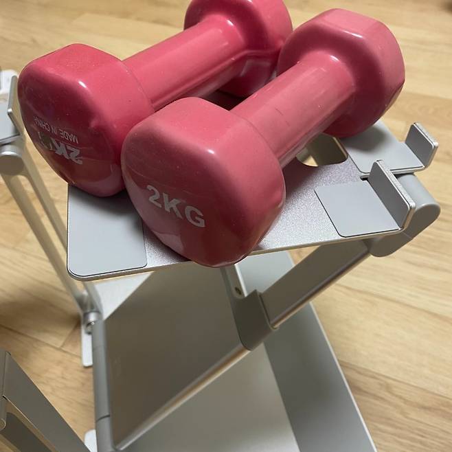 이처럼 단단한 관절을 가져서 인지 노트북 거치대는 최대 6킬로그램, 태블릿 거치대는 최대 4킬로그램까지 견딜 수 있다고 합니다. 아무리 무거운 노트북이라고 이 정도는 거의 없으니 안심하고 거치할 수 있겠네요. 사용하는 노트북 중에서 가장 무거운 것이 16인치 게이밍 노트북인데 이 정도 올려두어도 끄떡없습니다. 시험 삼아 6킬로그램짜리 케틀벨을 올려 봤는데 아래 거치 쪽에 두면 안정되게 받쳐주지만 상단 끝에 두면 힘에 부쳐 아래로 내려갑니다. 노트북의 경우 힘 점이 한 곳에 몰리는 케틀벨과 다르니 문제는 없어 보입니다. 태블릿 거치대에도 4킬로그램 덤벨을 올렸지만 의외로 잘 버티네요.
