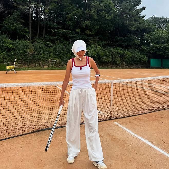 그녀는 깔끔한 화이트 컬러의 스퀘어넥 골지 슬리브리스를 선택해 시원하고 청량한 무드를 강조했다. 넥라인과 암홀의 레드 트리밍 디테일이 세련된 포인트로 작용했으며, 하의는 와이드한 화이트 팬츠로 편안하면서도 활동성을 높였다. 특히 머리에는 통풍이 잘 되는 스카프를 모자처럼 연출해 피부 보호와 스타일을 동시에 챙겼으며, 엘보에 착용한 미니 아대는 땀 흘러내림 방지 기능과 패션 포인트 역할을 했다.