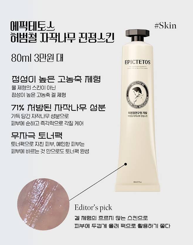에픽테토스의 모든 제품들은 정제수를 베이스로 하지 않고, 물보다 280% 수분함량이 높은 자작나무 수액 약 71%를 처방하여 베이스로 만들었기 때문에 수분감을 따라올 자가 없다. 그래서 이 진정 스킨은 스킨임에도 보습력 최강 스킨으로 스킨뿐 아니라 단 5분만 레이어링 후 톡톡 흡수 시켜주면 팩의 효과를, ‘젤’ 제형으로 스킨 하나만으로도 앰플 효과까지 얻을 수 있는 일석삼조 제품.