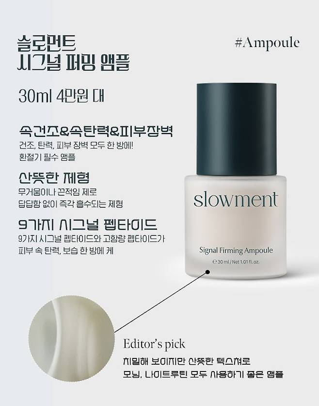 이 모든 피부 고민을 케어해 주는 슬로먼트의 시그널 파밍 앰플은 치밀하고 되직한 앰플 텍스처로 따로 수분크림이 필요 없이 이 제품 하나로도 유수분 밸런스가 맞춰지고 수분 보습감이 꽉 채워져서 에디터의 환절기 가을, 겨울 필수 템이라 할 수 있다.