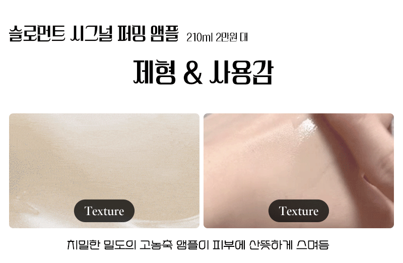우유 빛깔이 도는 고농축된 텍스처다. 보통의 앰플보다 훨씬 되직하고 쫀쫀한 제형으로, 여름철에는 별도의 수분크림 없이 슬로먼트 앰플만으로도 충분할 정도.