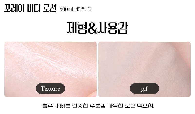 보기에는 꽤 꾸덕꾸덕해 보이는데 문지르면 수분이 가득한 제형으로 피부 깊은 곳까지 수분이 전달되는 것이 느껴지며 흡수력이 뛰어나서 바르는 즉시 끈적임 없는 마무리감이 좋아 바디로션을 꺼려 하는 남성들도 선호하는 제품.