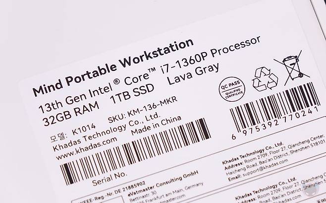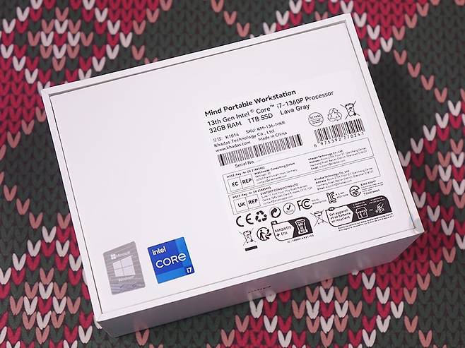 박스 후면에는 해당 제품 미니PC의 하드웨어 사양 표기를 확인할 수 있는데, 마인드(Mind) 미니 PC는 기본형(Standard)과 고급형(Premium) 2가지 사양으로 출시되었습니다. 두 사양 모두 인텔 13세대(Intel 13th) 모바일 CPU가 탑재되었는데, 기본형은 i5(1340P) 등급, 고급형은 i7(1360P) 등급이 탑재되었으며, 등급에 따라 램(RAM)과 SSD 용량도 차이를 두고 있습니다. 물론, CPU 등급 차이가 있기 때문에 CPU에 내장된 인텔 Xe 그래픽도 약간의 차이가 있죠. CPU와 램, SSD를 제외하면 나머지 하드웨어 구성 지원은 모두 동일합니다. 그리고, 또 하나 눈에 띄는 점은 국내 전자제품 안전(KC) 인증 표기를 확인할 수 있는데, 최근 이슈가 되었던 해외직구 정책에서도 걱정 없이 자유롭게 구입할 수 있고, 뒤에서 확인하겠지만 기본적으로 운영체제도 윈도우11 홈(Windows 11 Home)으로 사전설치되어 있죠.