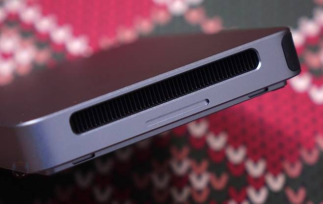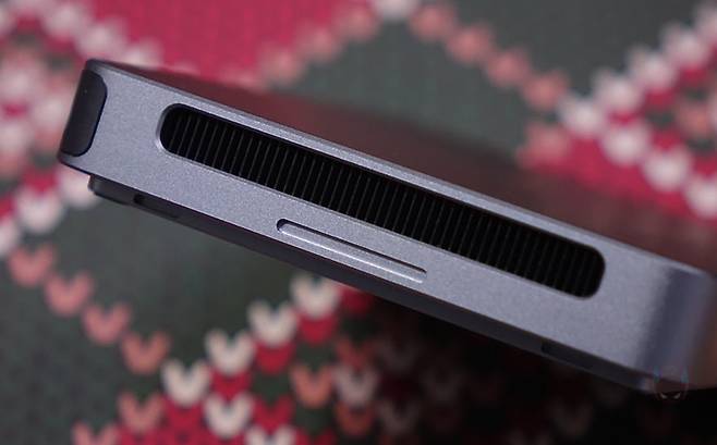 마인드 미니PC(Mind mini PC)를 좀 더 자세히 살펴보면, 상단에는 심플하게 Khadas 로고를 새겨놨으며, 상단과 전면이 만나는 모서리 라인 중간에는 전원버튼(Power button)이 배치되어 있는데, 버튼 중아에는 작동상태를 확인할 수 있는 LED 램프(Lamp)가 적용되어 있습니다. 참고로, 버튼을 3초 이상 누르고 있으면 종료 메시지가 나오고, 8초 이상 누르고 있으면 강제 종료할 수 있습니다. 그리고, 양쪽 측면에는 내부에서 발생하는 발열을 배출할 수 있도록 에어홀 처리가 되었는데, 내부에 장착된 방열핀 일부도 볼 수 있습니다. 참고로, 마인드 미니 PC 내부에는 히트싱크 방열핀과 함께 블로우 팬이 장착되어 있으며, 증기챔버 액체 쿨링(VC(Vapor Chamber) liquid cooling) 기술로 적용되어 있습니다. 공기유입은 오른쪽 측면과 후면에서 이루어지고 배출은 왼쪽 측면으로 나가죠.