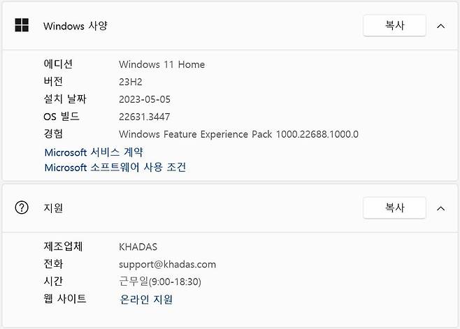 그럼, 카다스(Khadas) 마인드 미니 PC(Mind mini PC)를 직접 사용해 보면, 일단 전원을 켜면 부팅이 바로 실행되는데, 앞서 언급했듯이 운영체제(OS)인 윈도우 11 홈(Windows 11 Home)이 사전설치되어 있기 때문에, 처음 시작 시 안내에 따라 윈도우 11 설정을 마무리해줘야 합니다. 그리고, 마인드 미니 PC의 바이오스 CMOS 메뉴를 잠깐 살펴보면, AMI 바이오스인 것을 확인할 수 있으며, 메인(Main)/고급(Advanced)/칩셋(Chipset)/보안(Security)/부트(Boot)/저장&종료(Save&Exit)까지 총 6가지의 메뉴를 확인할 수 있습니다. 고급(Advanced) 메뉴에서 CPU와 램, 내장그래픽, 네트워크 등 전반적인 하드웨어 사양을 설정할 수 있는데, 램과 SSD가 내장된 형태이기 때문에 기본 상태 그대로 사용하는 게 무난하겠습니다.