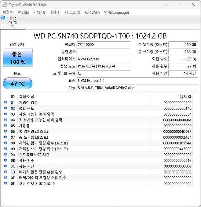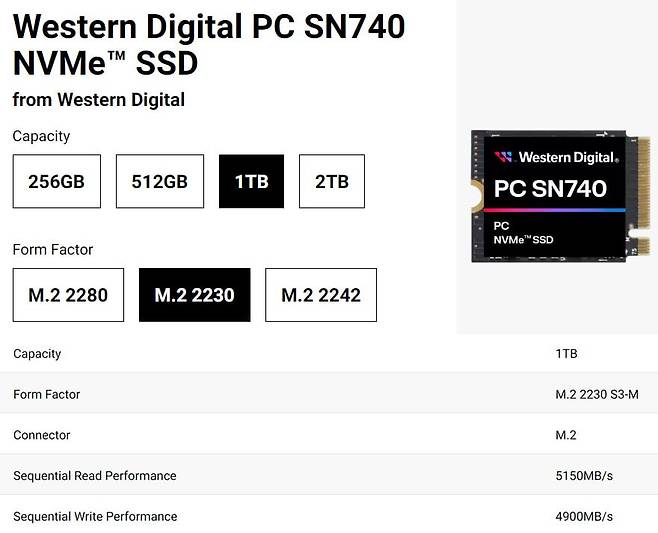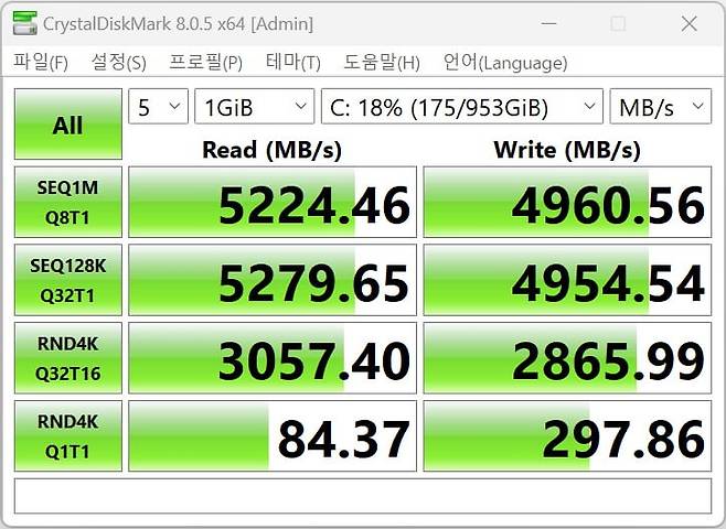 그리고, 마인드 미니 PC에는 SSD도 기본 내장이 되었다고 언급했는데, 고급형 옵션 제품으로 구입하면 1TB 용량이 탑재되어 있고, SSD는 WD SN740 모델을 사용했으며, PCIE 4.0x4 규격으로 2230 사이즈를 가진 제품입니다. CrystalDiskMark를 통해 실제 속도성능을 확인해 보면, 제품 스펙대로 최대 읽기와 쓰기 속도가 나오는 걸 확인할 수 있죠.