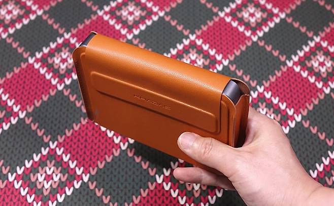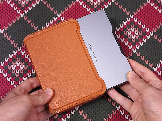 이렇게 기존의 미니PC보다 슬림하고 가벼운 무게 자랑하기 때문에, 마인드 미니 PC는 휴대성이 강조되는 만큼 휴대할 때 보관할 수 있는 전용 가죽케이스도 따로 구매할 수 있습니다. 휴대용 가죽케이스(Portable leather case, https://s.click.aliexpress.com/e/_DDTfRTH)를 실제로 접해보면, 가죽 느낌답게 브라운(Brown) 색상을 가졌으며, 질감도 꽤 고급스러운 느낌을 줍니다. 여기에 오픈(Open) 부분에는 Khadas 로고(Logo)를 음각으로 새겨놨으며, 자석(Magnetic) 방식으로 열고 닫을 수 있죠. 마인드(Mind) 미니 PC를 자주 휴대 사용한다면 전용 케이스를 추천합니다.