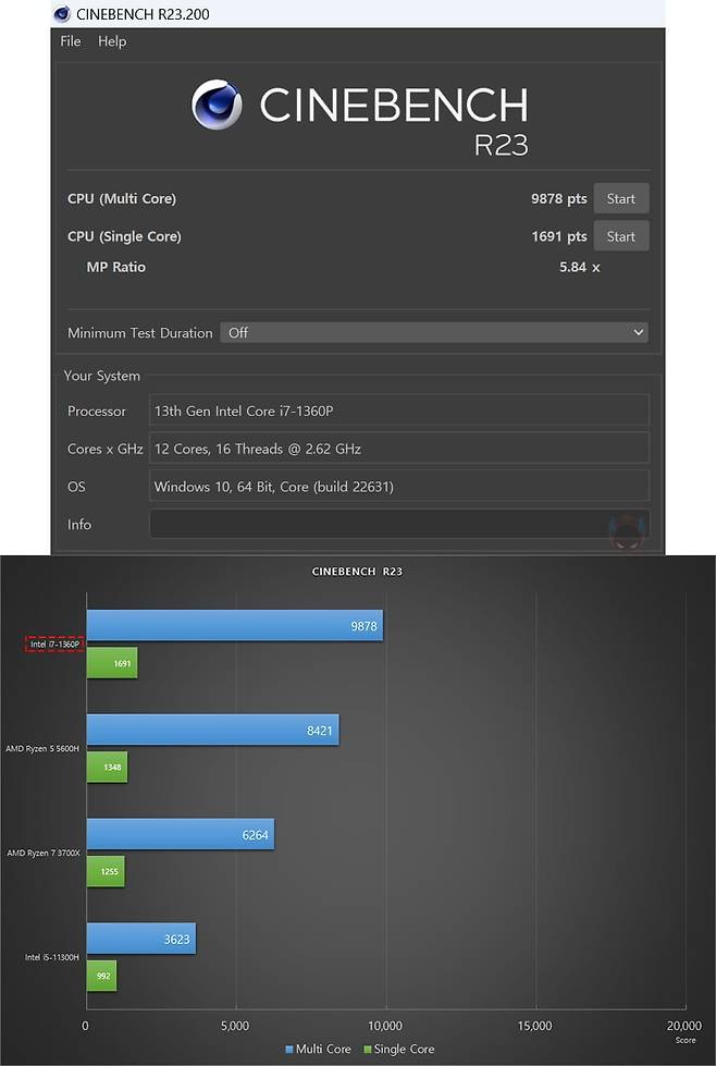 이제 마인드(Mind) 미니 PC의 사양을 확인해보는데, 앞서 언급했듯이 운영체제(OS)는 윈도우 11 Home이 사전 설치되어 있습니다. 또한, CPU 역시 앞서 언급한대로 기본형(Standard)과 고급형(Premium) 옵션에 따라 차이가 있는데, 리뷰에선 고급형 모델로 인텔 13세대 i7-1360P CPU가 탑재되었으며, 12코어(Cores)/16쓰레드(Threads) 구조입니다. 그리고, 메모리는 DDR5 규격으로 정확히는 저전력의 LDDR5이며, 클럭은 5200MHz입니다. 그래픽은 CPU의 내장그래픽으로 인텔 아이리스 Xe(Intel Iris Xe)죠. 그래서, 일단 CPU 성능부터 확인을 해보면, 인텔 i7-1360P 같은경우 가장 많은 코어와 쓰레드 구조를 가졌고, 부스트클럭도 최대 5.0GHz까지 도달하기때문에 비교대상 CPU들 중에서는 CPU-Z Bench, Geekbench, Passmark PerformanceTest CPU Mark, Cinebench R23 벤치마크 프로그램 모두에서 가장 좋은 점수를 보여줍니다. 물론, 고성능 수준은 아니지만, 게임을 제외한 편집작업 등의 용도로는 충분히 소화할 수 있는 성능이죠. 마인드 미니PC의 크기를 고려하면 시작에서 언급했듯이 휴대성이 강조되는 크기대비 성능은 만족스러운 수준이라 할 수 있습니다.
