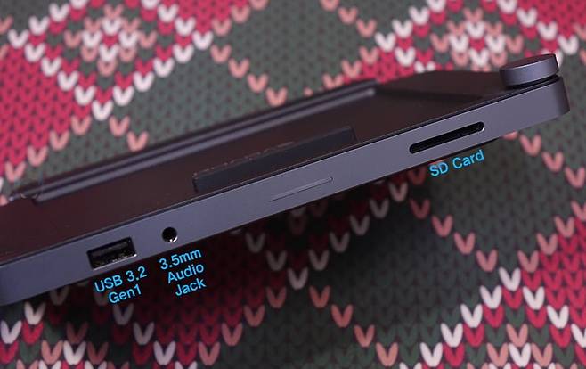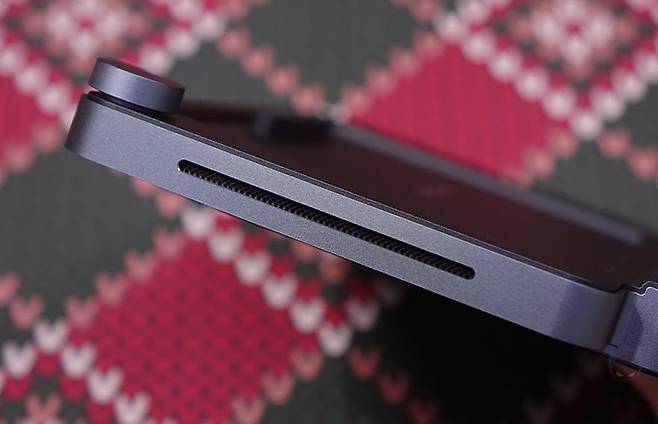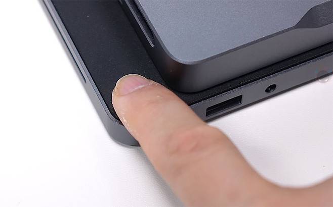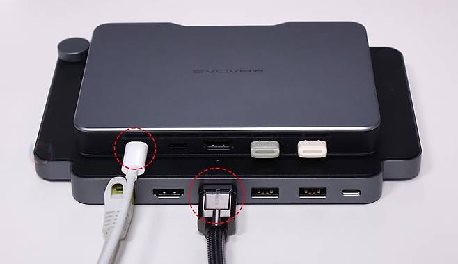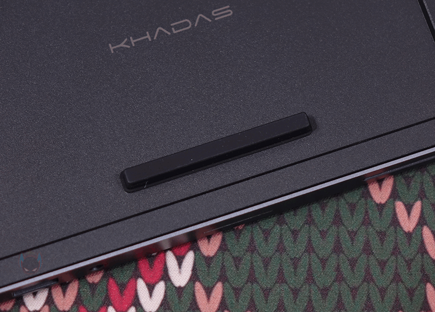 마인드 독(Mind Dock)을 좀 더 자세히 살펴보면, 상단에는 마인드 미니PC처럼 중앙에 Khadas 로고를 새겨놨으며, 마인드 미니 PC 크기만큼 약간 안으로 오목하게 처리된 모양을 확인할 수 있는데, 앞부분에 역시 고무 커버가 적용되어 있고, 커버를 벗이면, 슬롯을 확인할 수 있습니다. 바로, 마인드 독 상단 슬롯에 맞춰, 앞서 확인한 마인드 미니 PC 밑바닥의 슬롯과 결합되는 형태죠. 뒤에서 다시 확인하겠지만, 마인드 미니 PC에는 대기 배터리가 내장되어 있기 때문에, 마인드 독에 장착 사용하다가 분리해서 마인드 미니 PC에 전원만 다시 연결하면 바로 사용할 수 있습니다.