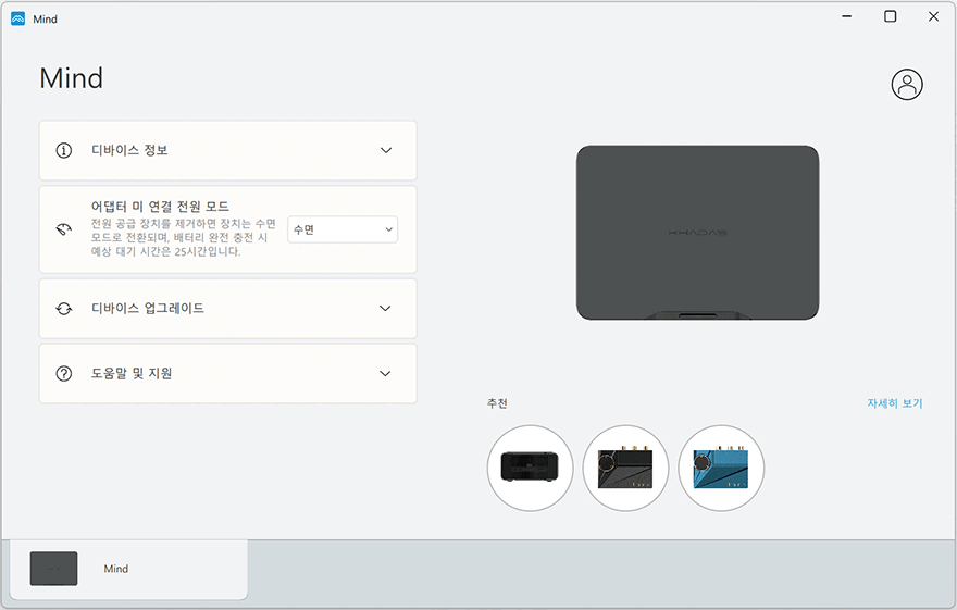 또한, 마인드 미니 PC(Mind mini PC)에는 전용 관리 앱(App)인 마인드 앱(Mind App)을 제공해주고 있는데, 운영체제 사전설치와 함께 자동 설치되어 있으며, 필요한 경우에는 홈페이지에서 다운로드(https://dl.khadas.com/products/mind/app/mind-app-install-v1.10.exe) 받을 수 있습니다. 일단, 기본 설치된 앱으로 살펴보면, 마인드 미니 PC의 디바이스 정보를 비롯해, 대기 배터리를 절전모드로 사용할지, 해제해서 사용할지 선택할 수 있는데, 해제하면 일반사용은 20분 정도밖에 사용하지 못하기 때문에 절전모드를 유지하는 걸 권장합니다. 이 밖에 디바이스 업그레이드로 EC와 바이오스(BIOS) 업데이트로 앱에서 손쉽게 진행할 수 있으며, 마인드 독(Mind Dock)과 연결되면 자동으로 앱에서도 인식되어 마인드 독의 디바이스 정보와 업그레이드도 진행할 수 있습니다. 마인드 미니 PC를 사용한다면, 마인드 앱을 꼭 함께 사용하길 추천합니다. 참고로, 마인드 앱 최신 버전으로 업데이트하면 대기 배터리 잔량을 확인할 수 있으며, 최신 EC 업데이트를 위해서는 최신 버전으로 업데이트해야 합니다.