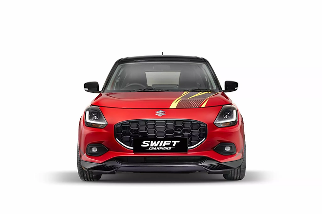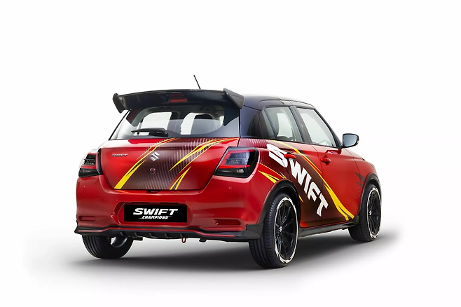 먼저, 스즈키 스위프트 챔피언스 콘셉트는 트랙을 겨냥한 듯한 디자인으로 눈길을 끈다. 날카로운 공기역학적 요소들과 흰색 스티커가 붙은 새로운 휠, 그리고 빨간색 차체에 담긴 대담한 데칼이 특징이다.