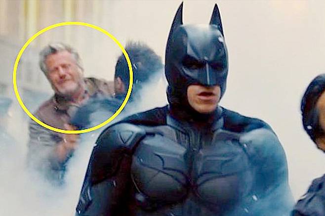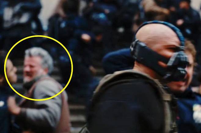 격투 장면에서 한 엑스트라는 배트맨의 힘에 놀라기라도 한 것인지, 맞기도 전에 뒤로 넘어집니다. 영화의 명장면 중 하나로 꼽히는 고담 시 경찰과 베인의 추종자들 사이에서 벌어지는 난투극 장면에서도 황당한 모습이 포착되었는데요.