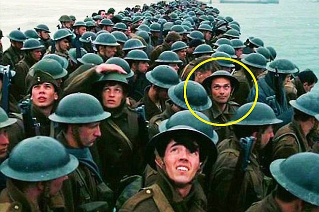 하지만 이런 <덩케르크>에도 엑스트라의 행동으로 인한 옥에 티가 존재했습니다. 여러 명의 군인들이 폭격기를 발견하는 장면에서 다들 겁에 질린 표정인 반면, 한 병사는 미소를 머금고 있었는데요.
