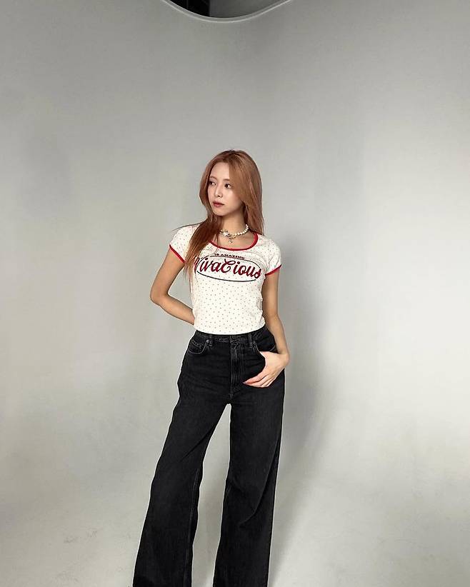 상의는 작고 타이트한 도트 프린팅 크롭티로, ‘Vivacious’ 레터링이 프런트를 장식하며 경쾌한 분위기를 자아낸다. 레드 컬러의 배색 포인트와 라운드 네크라인은 복고 감성을 한층 살려준다. 하의는 블랙톤의 와이드 데님 팬츠로, 허리를 타이트하게 잡아주면서 다리는 길고 슬림하게 연출된다. 특히 크롭 기장 덕분에 허리 라인과 골반이 자연스럽게 강조되며, 전체적인 비율이 극대화됐다.