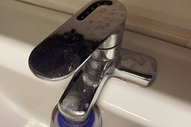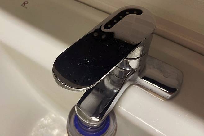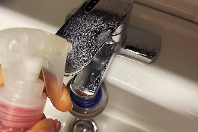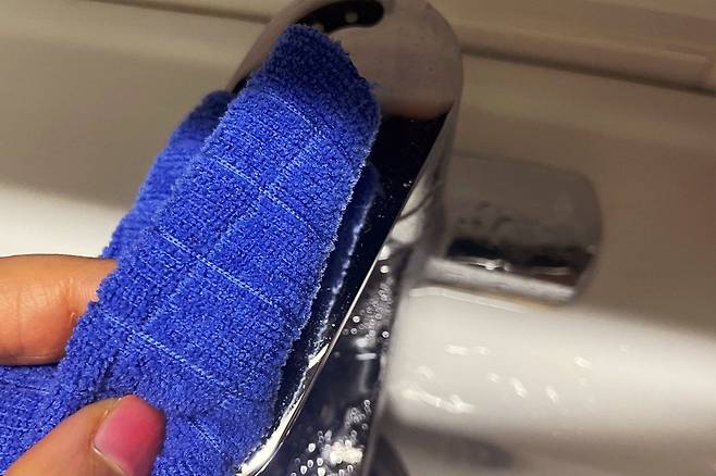 이제 데운 식초로 욕실을 청소해 볼 건데요. 먼저 수전을 청소해 볼 거예요. 수전은 물때가 정말 잘 생기죠