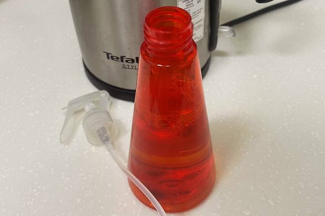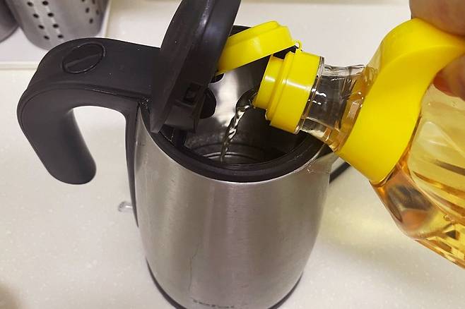 식초를 40도 정도로 데워서 사용하면 되는데 전기포트 내부에 기포가 살짝 올라오면 전원을 바로 꺼 주세요. 팔팔 끓이시면 아세트산 성분이 날아가 효능이 사라진다고 하니 반드시 살짝만 데워 주세요.