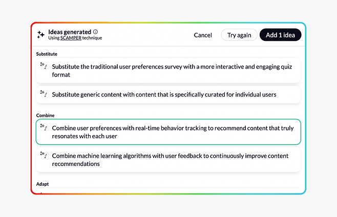 아래와 같이 해당 기법을 적용한 14가지 정도의 아이디어를 제안해주었고 이 중 마음에 드는 아이디어를 골라 내 워크스페이스에 추가할 수 있었습니다. 아이디어는 새로 생성할 수도, 마음에 드는 게 없다면 추가로 생성할 수도 있었어요.