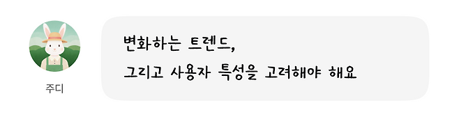 - 트렌드를 무조건 따라가는 것이 아닌 각 플랫폼 특성에 맞춰 서비스를 이용하는 사용자의 연령 및 특성을 고려해야 합니다.