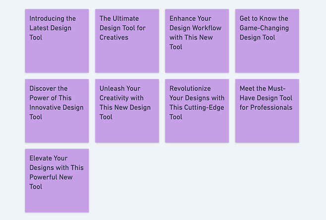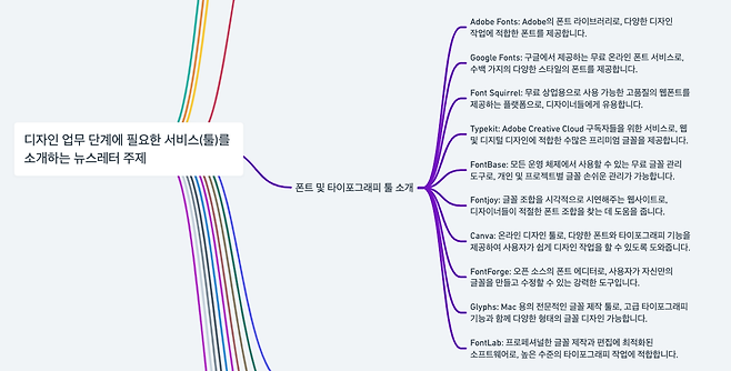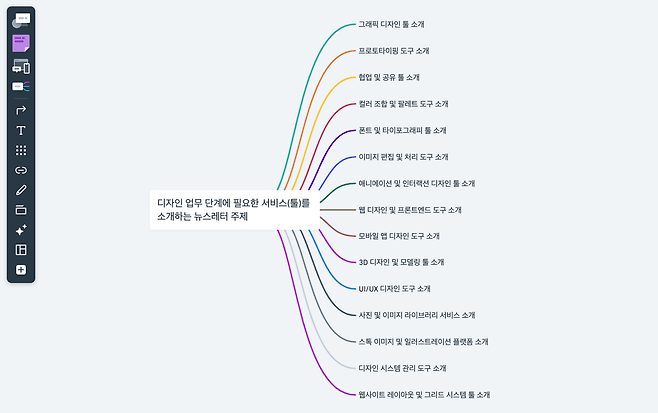 마인드맵을 선택한 뒤, ‘디자인 업무 단계에 필요한 서비스를 소개하는 뉴스레터 주제’를 입력했더니 몇 초가 지나지 않아 위와 같은 결과를 확인할 수 있었어요. ‘디자인’이라는 포괄적인 주제에 포함될 수 있는 다양한 내용을 포함된 모습이에요. 물론 아직 만족할만한 수준은 아니지만 어떻게, 어디서부터 시작하지? 에 대한 고민을 많이 줄여줬어요.