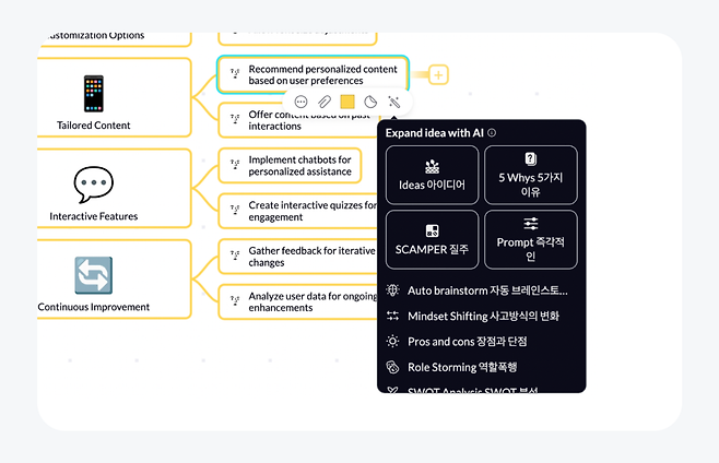- 다양한 브레인스토밍 기법을 제공하고, 여기에 AI를 활용해 아이디어를 빠르게 확장할 수 있어요.