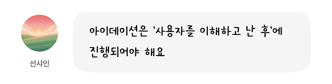 - '아이데이션은 '사용자를 이해하고 난 후'에 진행되어야 한다.