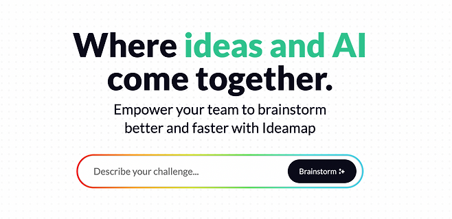 오늘 첫 번째로 소개하고 싶은 서비스는 ‘ideamap’입니다. 이전 뉴스레터에서 소개한 miro와 유사하게 AI를 활용해 아이디어를 확장시켜주는 서비스인데요, 주제를 입력하면 마인드맵 형식으로 다양한 아이디어를 제안받을 수 있습니다. ideamap 홈페이지에서는 모든 브레인스토밍을 위한 하나의 플랫폼이라고 소개하고 있는데 실제로도 정말 다양한 브레인스토밍 기법을 다루고 있었어요! 하나씩 자세히 살펴볼까요?