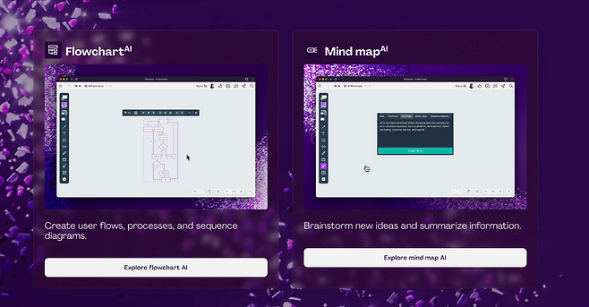 - 모든 기능에 AI가 도입된 건 아니지만, 마인드맵과 플로우 차트, 와이어프레임과 다이어그램 제작이 가능하기에 초기 프로젝트 관리 등에 필요한 내용을 한곳에서 쉽게 관리할 수 있어요.