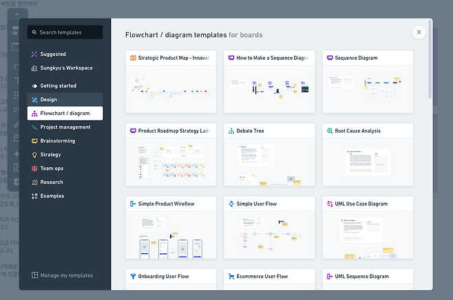모든 기능에 AI를 활용할 순 없지만, 이렇게 기능 단위를 ‘템플릿’으로 제공하고 있어, 빠른 시작 및 편집이 가능해요. 플로우차트, 다이어그램에는 프로덕트 로드맵 전략, 사용자 플로우, 프로덕트 와이어플로우 등 업무에 자주 활용하는 내용들이 템플릿으로 공유되고 있어 참고하기 좋은 환경을 제공해요.