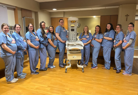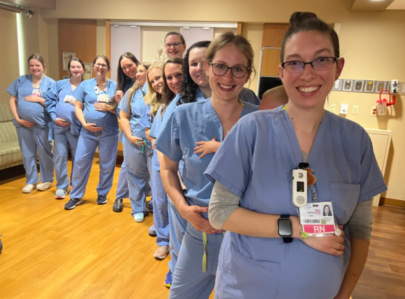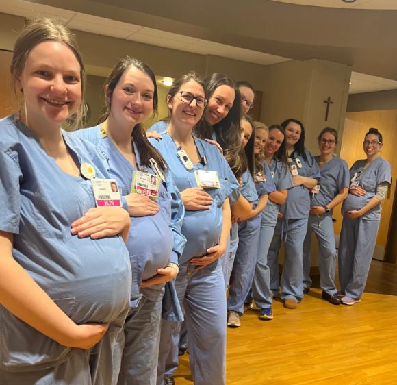 병원이 함께 공개한 사진에서 수술복 차림의 간호사들(14명 중 11명만 사진 촬영)은 아직 태어나지 않은 배 속의 아이를 안는 포즈를 취하며 밝은 미소를 지었다.