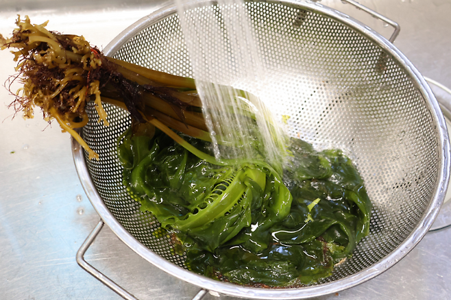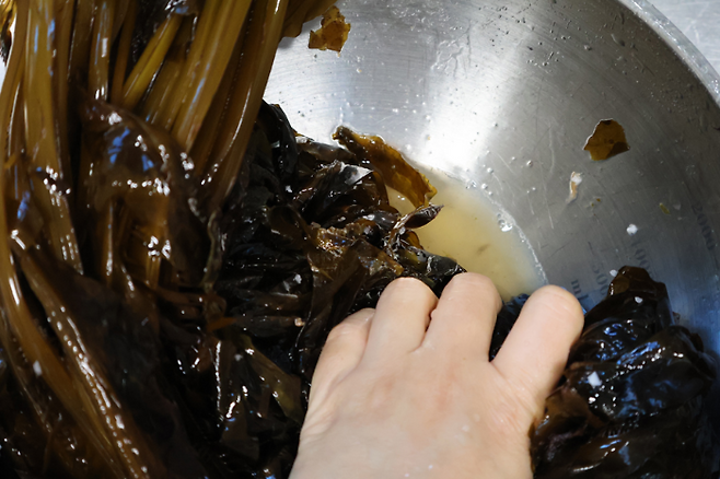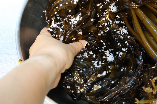 부드러운 미역 부분에 굵은소금 조금 뿌린 다음 바락바락 씻어요.