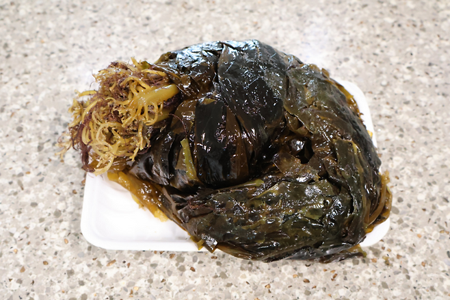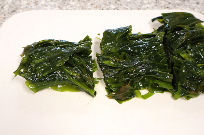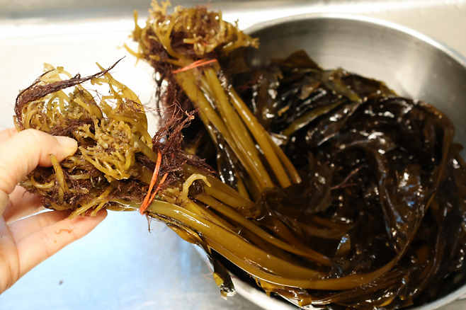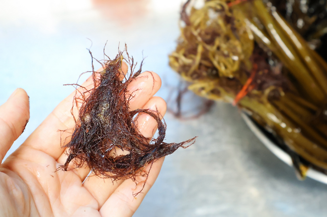 이렇게 두꺼운 미역 뿌리부분은 고무줄로 묶여 있는데요. 고무줄을 풀지 마세요. 손잡이 역활을 할거예요. 고무줄을 풀면 제각각 흩어지기 때문에 손질하고 데치기 번거로워진답니다. 어차피 고무줄이 묶인 부분은 질겨서 먹지 못하니 손잡이로 쓰고 잘라 버리면 돼요.