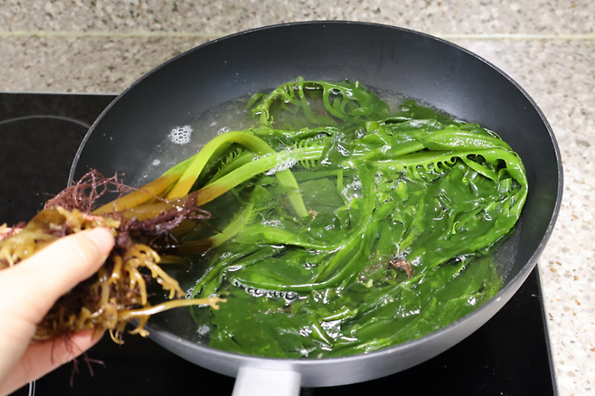 물이 끓으면 미역 손잡이를 잡고 넣어요. 뜨거운 물에 닿자마자 이렇게 초록 빛으로 변한답니다.