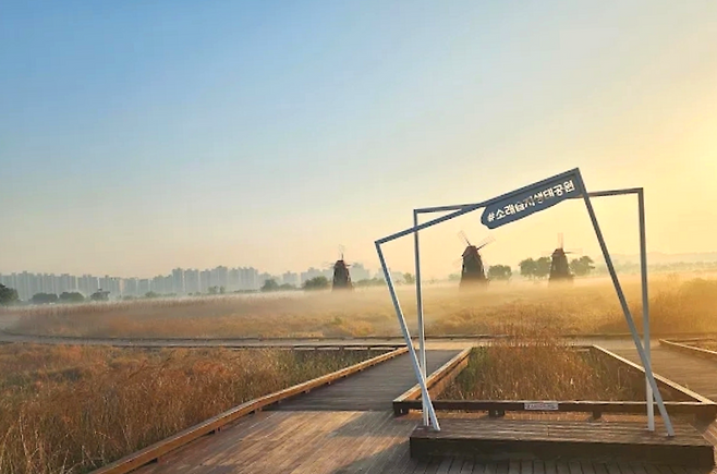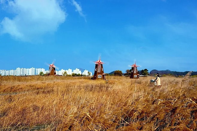 해가 기울기 시작하면 공원의 분위기는 빠르게 바뀐다. 갈대밭 사이로 서 있는 붉은 풍차가 자연스럽게 시선을 끈다. 그 뒤로 주황빛 노을이 번질 때면, 굳이 설명하지 않아도 되는 장면이 완성된다.