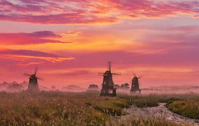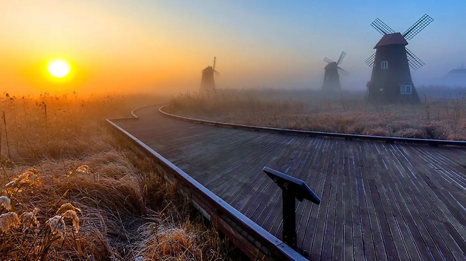 해가 천천히 얼굴을 내밀면 갈대 끝과 풍차 실루엣에 금빛이 얹힌다. 거창한 다짐은 필요 없다. “오늘도 잘 지내보자”라는 생각이면 충분하다. 그 장면 하나로 하루의 방향이 자연스럽게 정리된다.