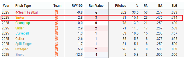 이런 데이터는 꽤 의미가 있다. 어쩌다 한 번씩, 가끔 오는 승부구가 아니다. 그러니까 싱커는 그가 많이 상대하고, 그럴 수밖에 없는 구질이다. 좌타자인 그에게 우투수들이 자주 쓰는 구종인 탓이다.